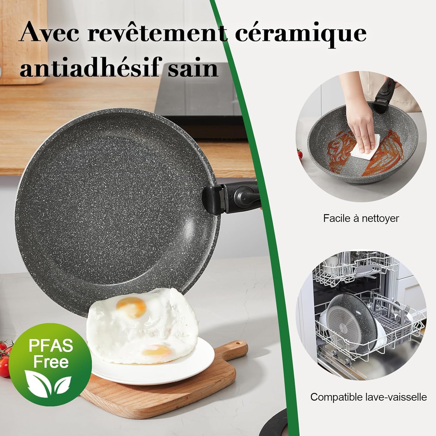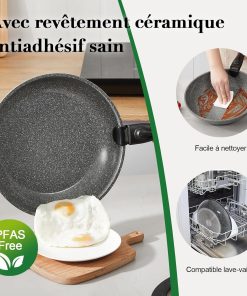 - Revêtement céramique sain : Ce set de cuisson est doté d'un revêtement antiadhésif en céramique Greblon CK2 d'Allemagne, sans PFOA, PTFE et PFAS. Elle permet de cuisiner avec moins d'huile pour une alimentation plus saine pour votre famille. Le revêtement antiadhésif de qualité exceptionnelle facilite grandement le nettoyage, y compris au lave-vaisselle