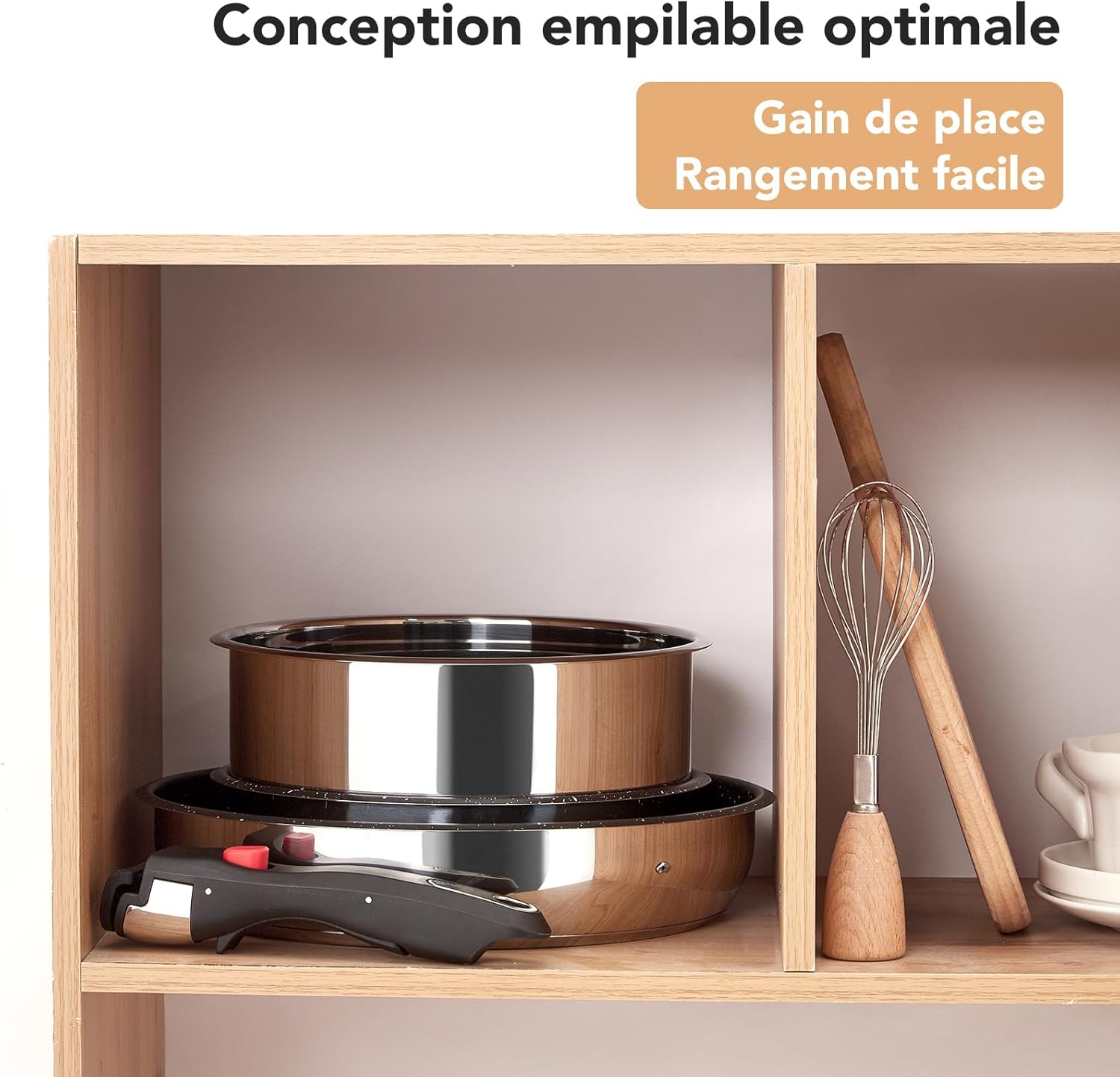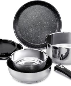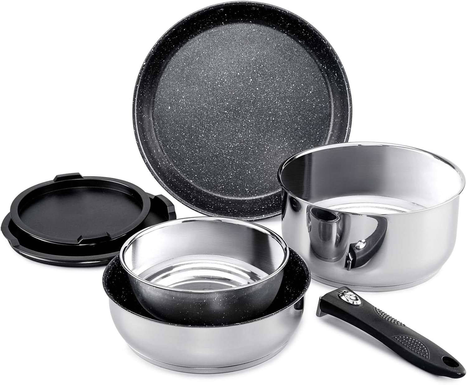 - Empilable et gain de place : Grâce aux poignées amovibles et à la conception empilable du set de poêles, 70 % d’espace sont économisés pour un rangement parfait. Le set de casseroles amovibles de ROSSETTO est idéal pour la cuisine et pour le camping