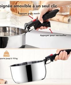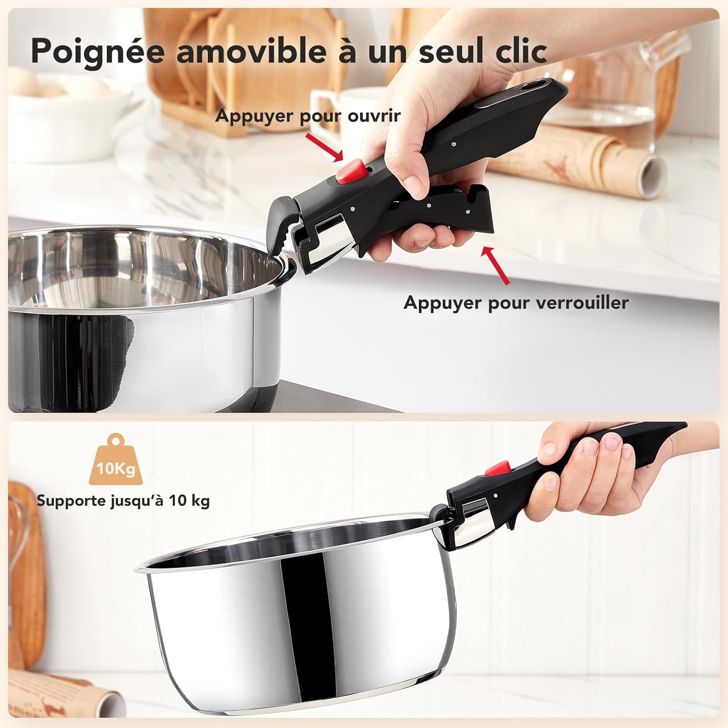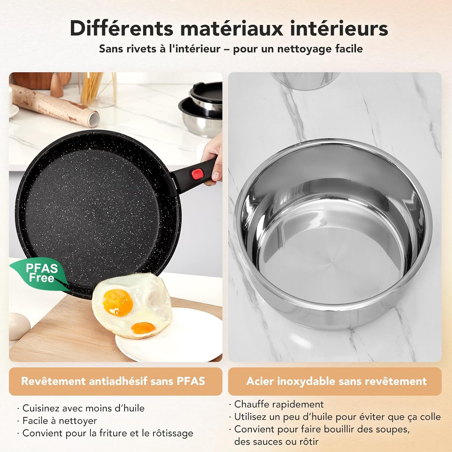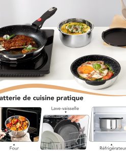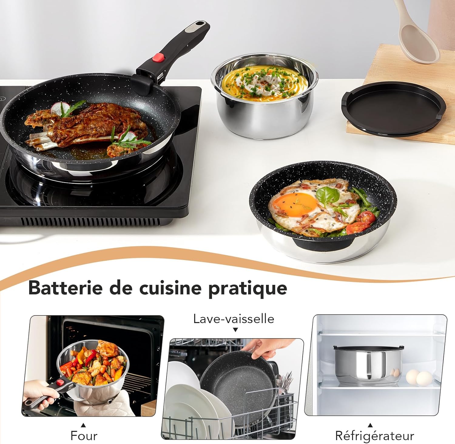 Set pratique et bien conçu, les pièces en inox chauffent de manière homogène et les poignées amovibles rendent le rangement et le nettoyage faciles; la poêle antiadhésive sans PFAS tient bien ses promesses pour les cuissons délicates et l’ensemble supporte le four sans souci, bon rapport qualité-prix pour une utilisation quotidienne.