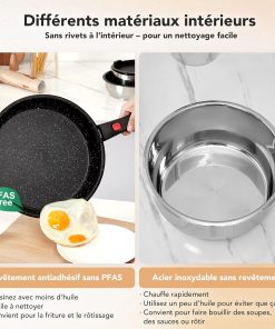 Ensemble bien pensé et polyvalent, l’inox donne une impression de solidité et le revêtement antiadhésif sans PFAS facilite le nettoyage; les poignées amovibles sont pratiques pour gagner de la place et passer au four, et la cuisson sur induction est uniforme, ce qui en fait un bon choix pour une utilisation quotidienne.