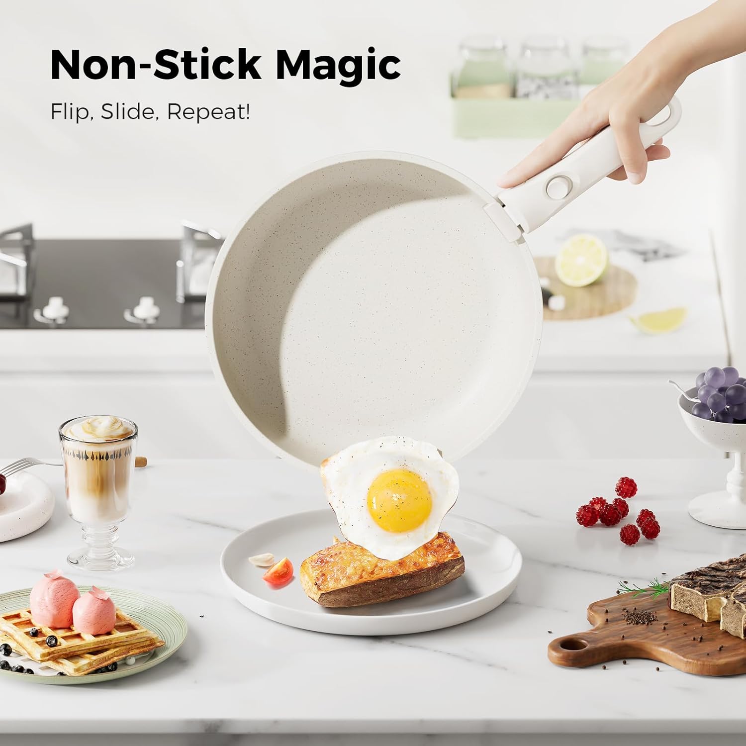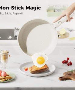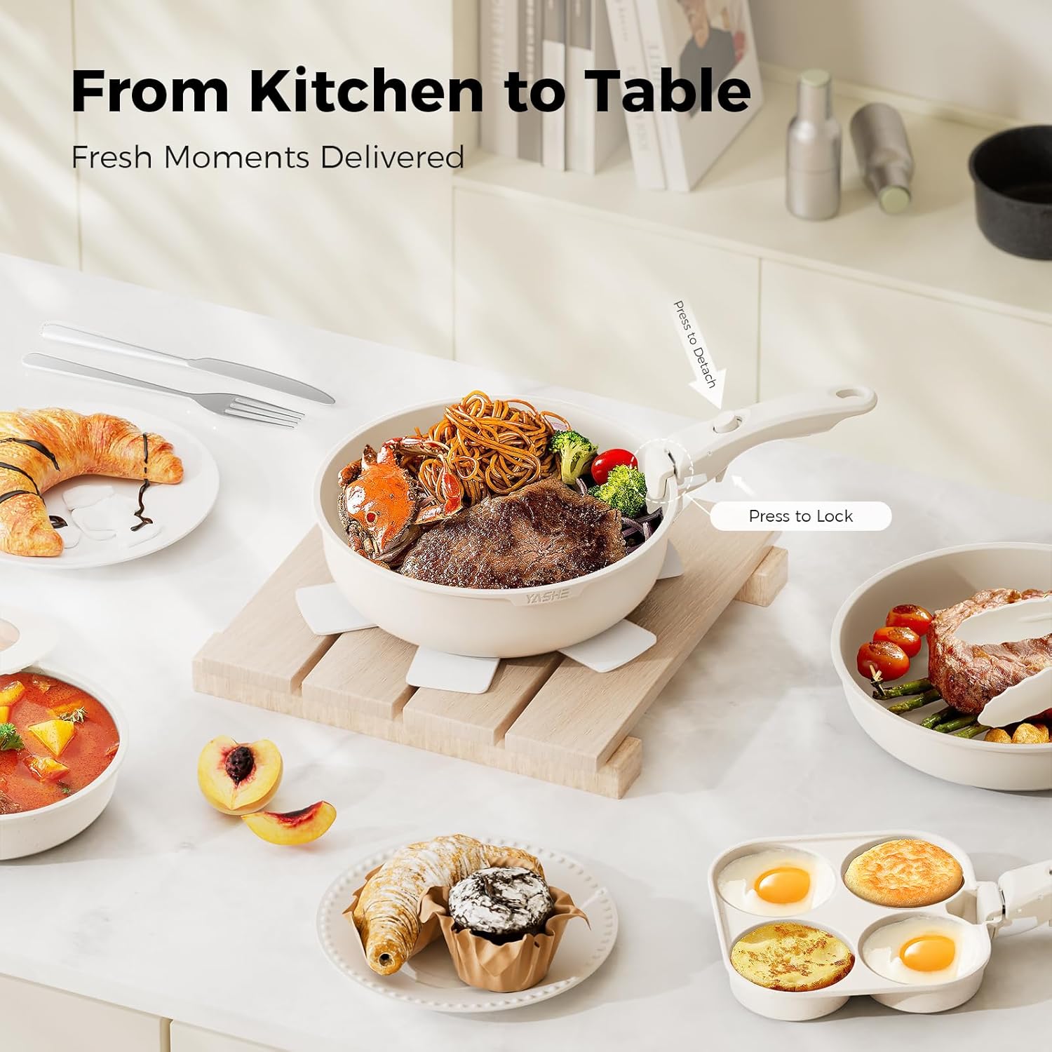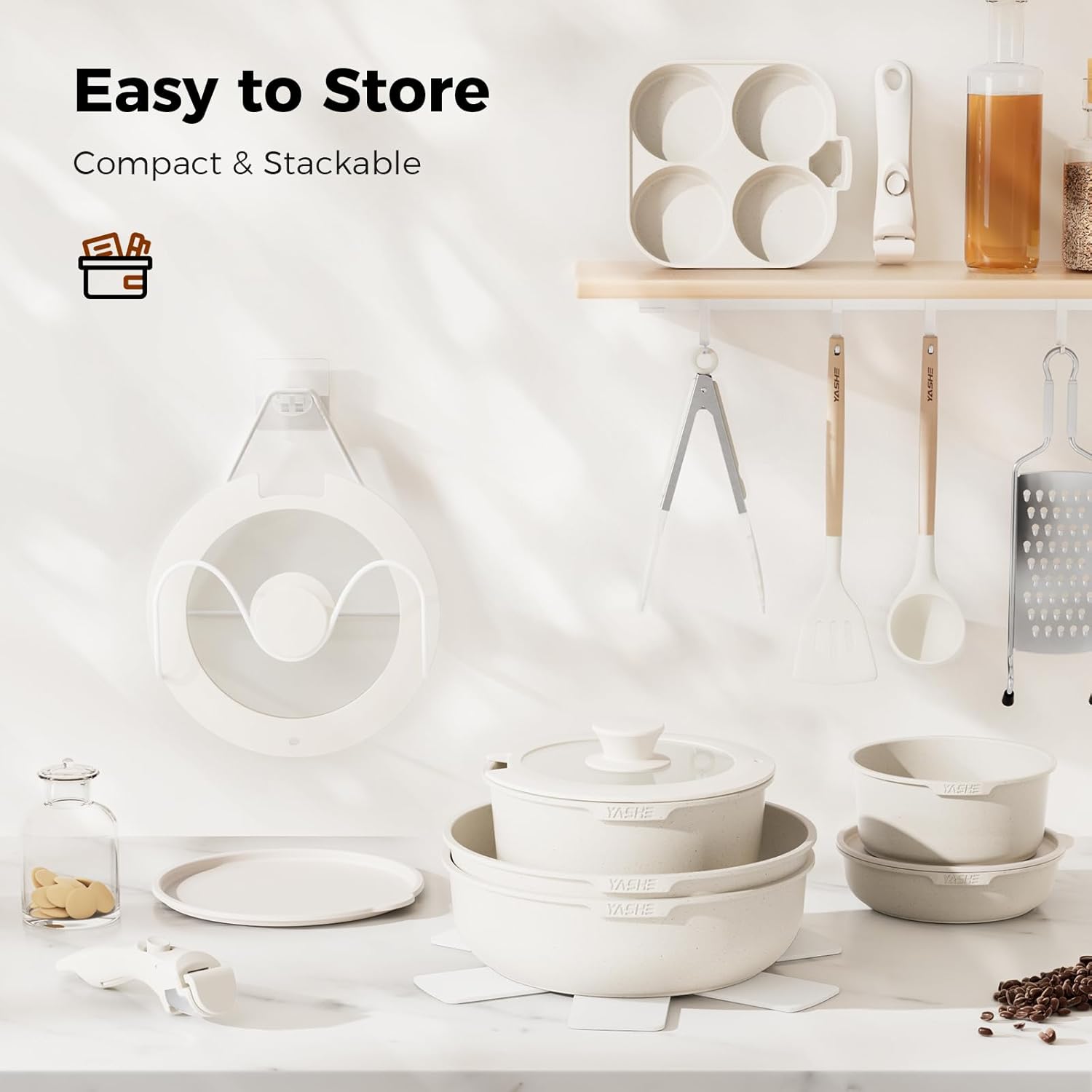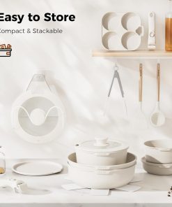 Excellent set pour les familles: les 20 pièces couvrent tous les besoins, le revêtement antiadhésif tient bien et facilite le nettoyage, les poignées amovibles rendent le rangement et l’utilisation au four super pratiques, et tout est compatible induction et lave-vaisselle. Le format empilable en blanc prend peu de place et semble solide pour un usage quotidien. Très satisfait du rapport qualité-prix.