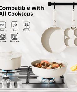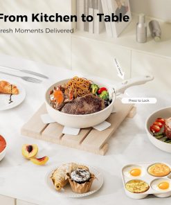 Ensemble bien conçu pour une famille : le revêtement antiadhésif facilite la cuisson et le nettoyage, les poignées amovibles et la compatibilité induction et four jusqu’à 230 °C apportent de la polyvalence, et le format empilable ainsi que la possibilité de passer au lave-vaisselle simplifient le rangement et l’entretien. La couleur blanche est discrète et s’intègre facilement à la cuisine.