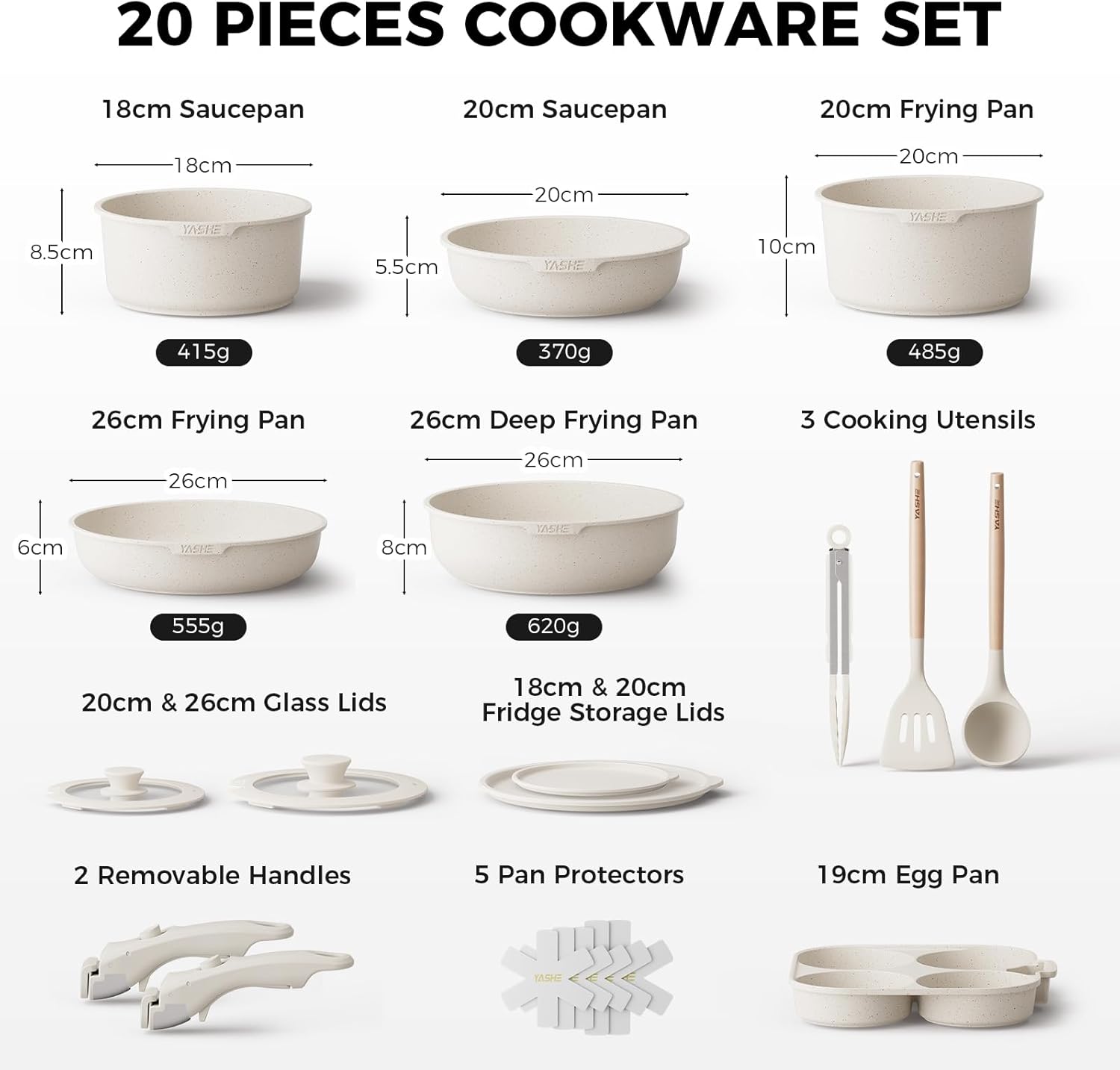 - Ensemble complet de 20 pièces : Comprend casseroles, poêles et ustensiles essentiels pour couvrir toutes vos nécessités culinaires quotidiennes.
