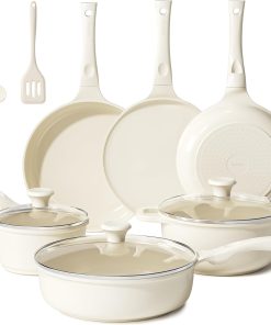 Ensemble pratique et bien conçu, les 11 casseroles en céramique chauffent de façon régulière et les couvercles en verre s’ajustent correctement; le fait qu’elles soient sans PTFE ni PFAS et compatibles avec tous les types de feux est rassurant, et elles se nettoient facilement au lave-vaisselle pour un entretien simple au quotidien.
