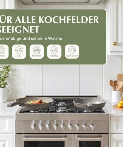 - Dimensions : 1 poêle 24 cm, 1 poêle 28 cm, 1 poêle à crêpe 26 cm, 1 sauteuse avec couvercle 28 cm, 1 casserole avec couvercle 16 cm/2 l, 1 Faitout avec couvercle 24 cm/4 l. Une large gamme de tailles pour répondre à tous vos besoins de friture, de cuisson, de braiser et de remuer. Chaque ustensile de cuisine dispose d’un revêtement en céramique de qualité alimentaire sans produits chimiques tels que PFAS et PTFE.