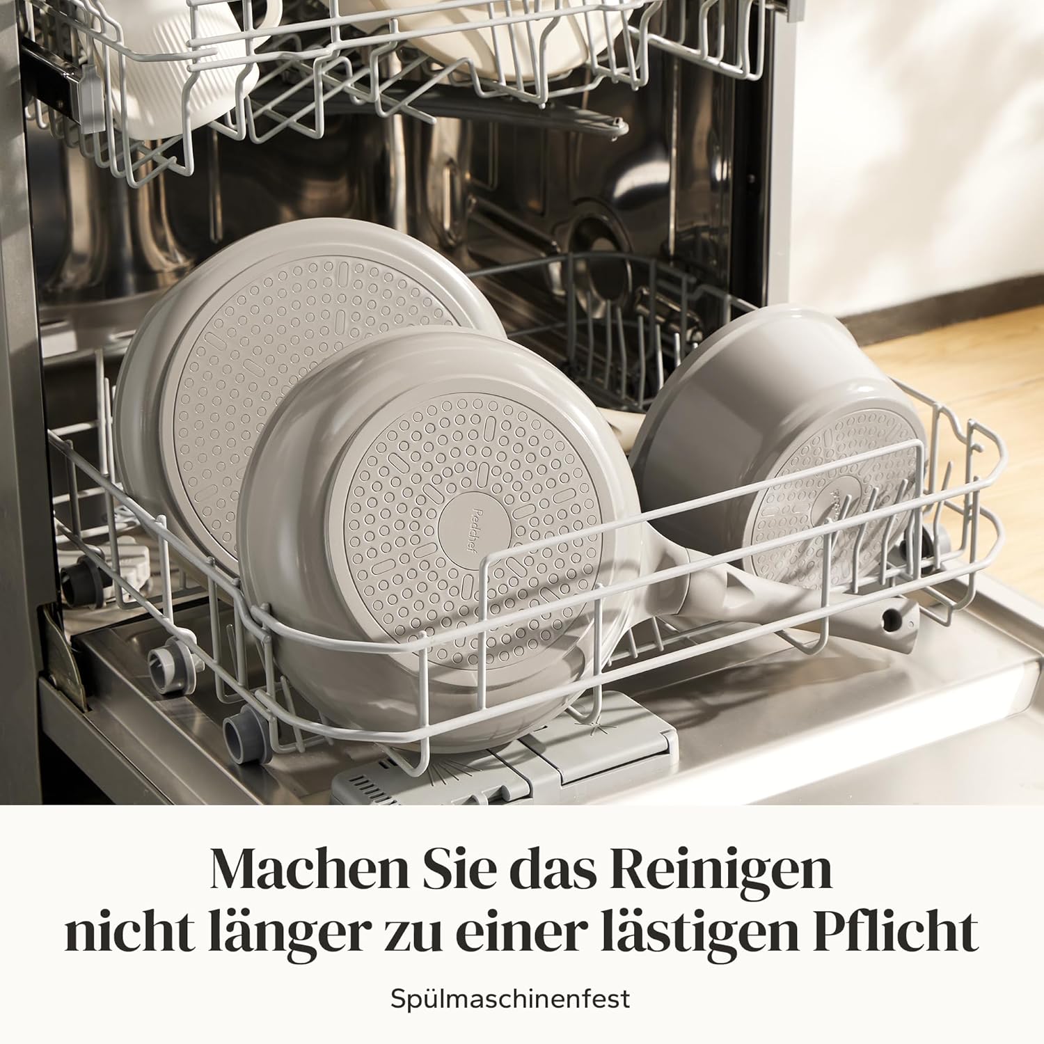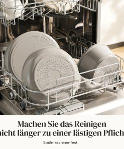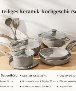 Ensemble de 11 casseroles en céramique très pratique, compatible avec l’induction et tous types de feux, sans PTFE ni PFAS; les couvercles en verre permettent de surveiller la cuisson, la finition grise est sobre et elles passent bien au lave-vaisselle, bon rapport qualité-prix.
