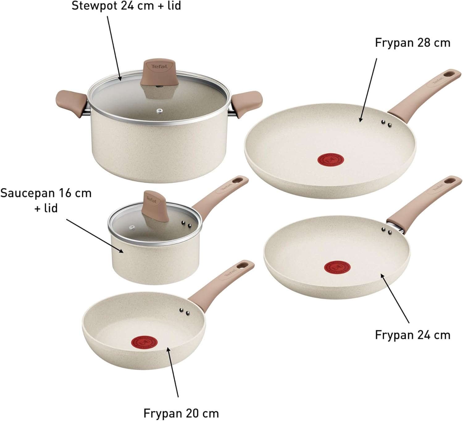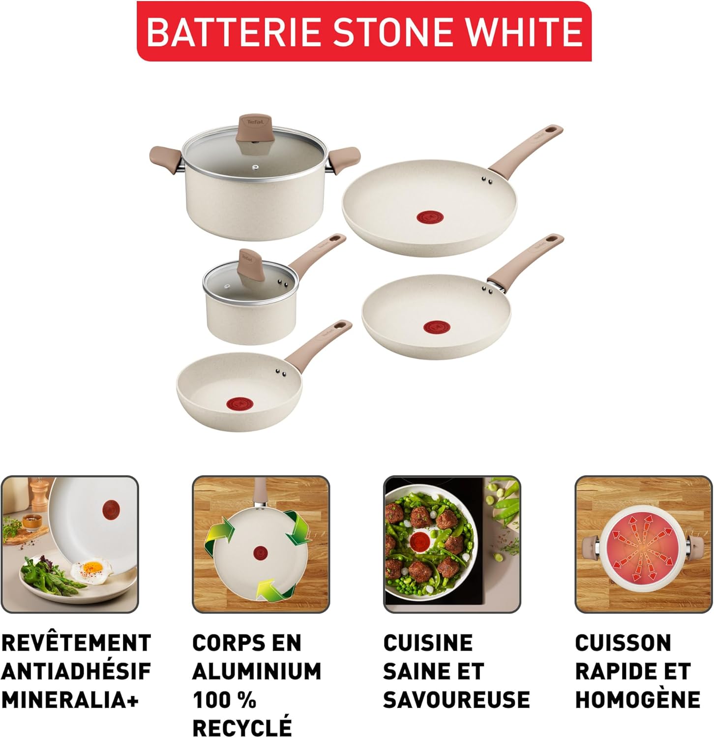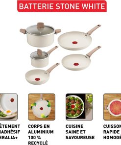Découvrez Stone White, la gamme d'ustensiles qui apporte une touche sublime et lumineuse à votre cuisine. Qu'il s'agisse de préparer de savoureux dîners la semaine, de nouvelles sauces dignes d'un chef ou des repas sains et savoureux, le revêtement antiadhésif Mineralia+ résistant offre une glisse parfaite et un nettoyage facile. Fabriquées avec des corps en aluminium 100% recyclé, ces poêles et casseroles fiables sont dotées de toutes vos fonctions préférées de Tefal. Contenu: Poêle (20cm) Poêle (24cm) Poêle (28cm) Casserole (16cm) avec couvercle Faitout (24cm) avec couvercle