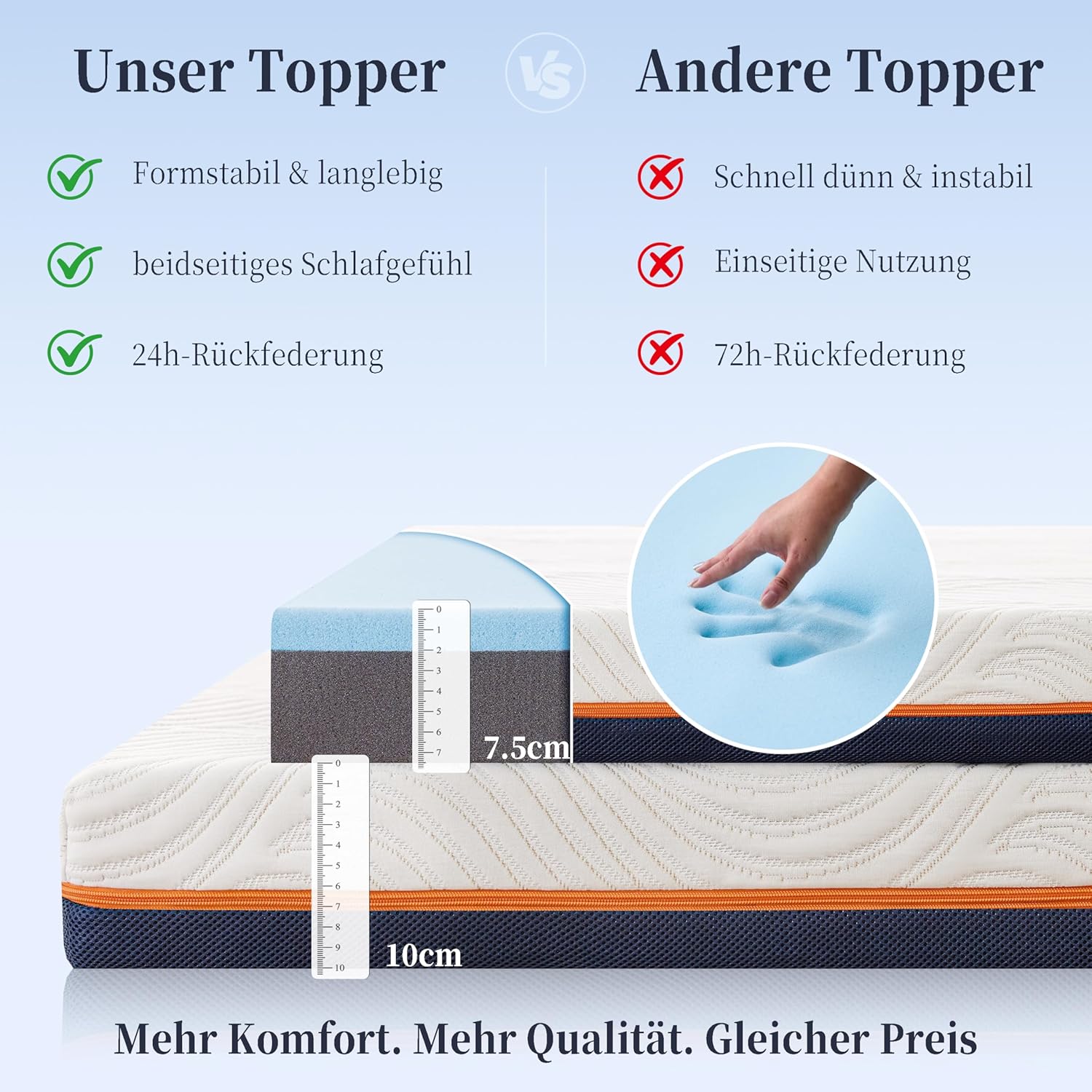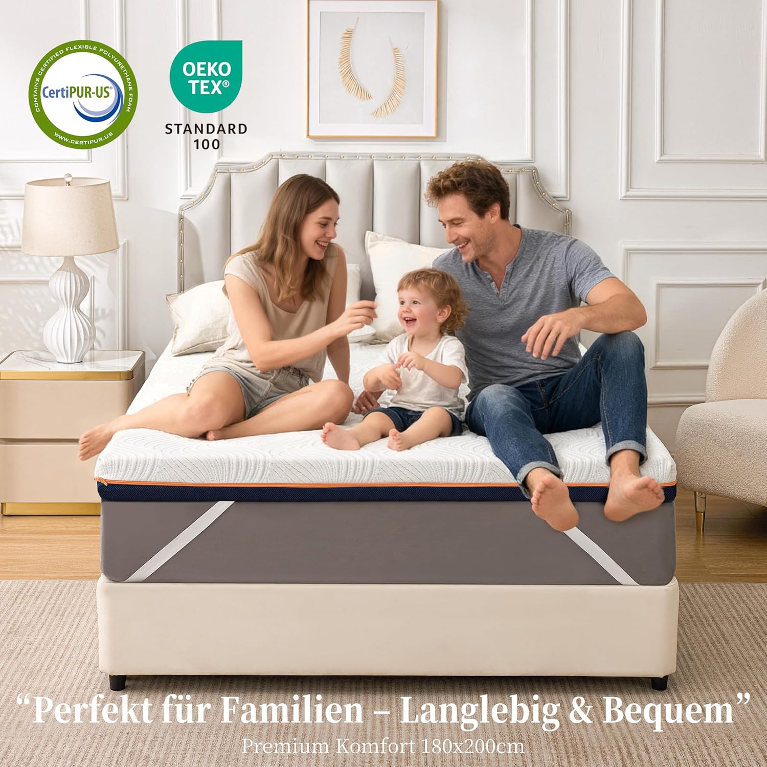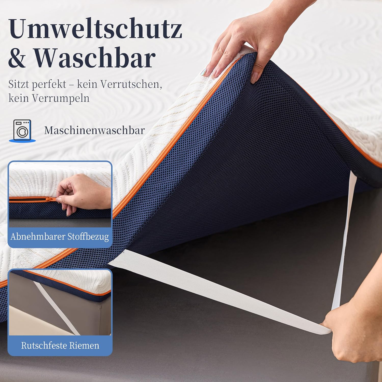 - 3️⃣ Housse Amovible, Lavable & Hypoallergénique Équipé d’une housse douce au toucher, anti-acariens et hypoallergénique. Fermeture éclair intégrale pour un retrait facile, lavage en machine ou à la main. Les 4 bandes élastiques renforcées assurent une fixation stable sur votre matelas sans glissement