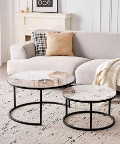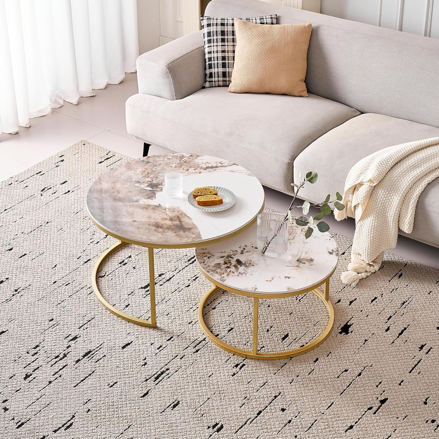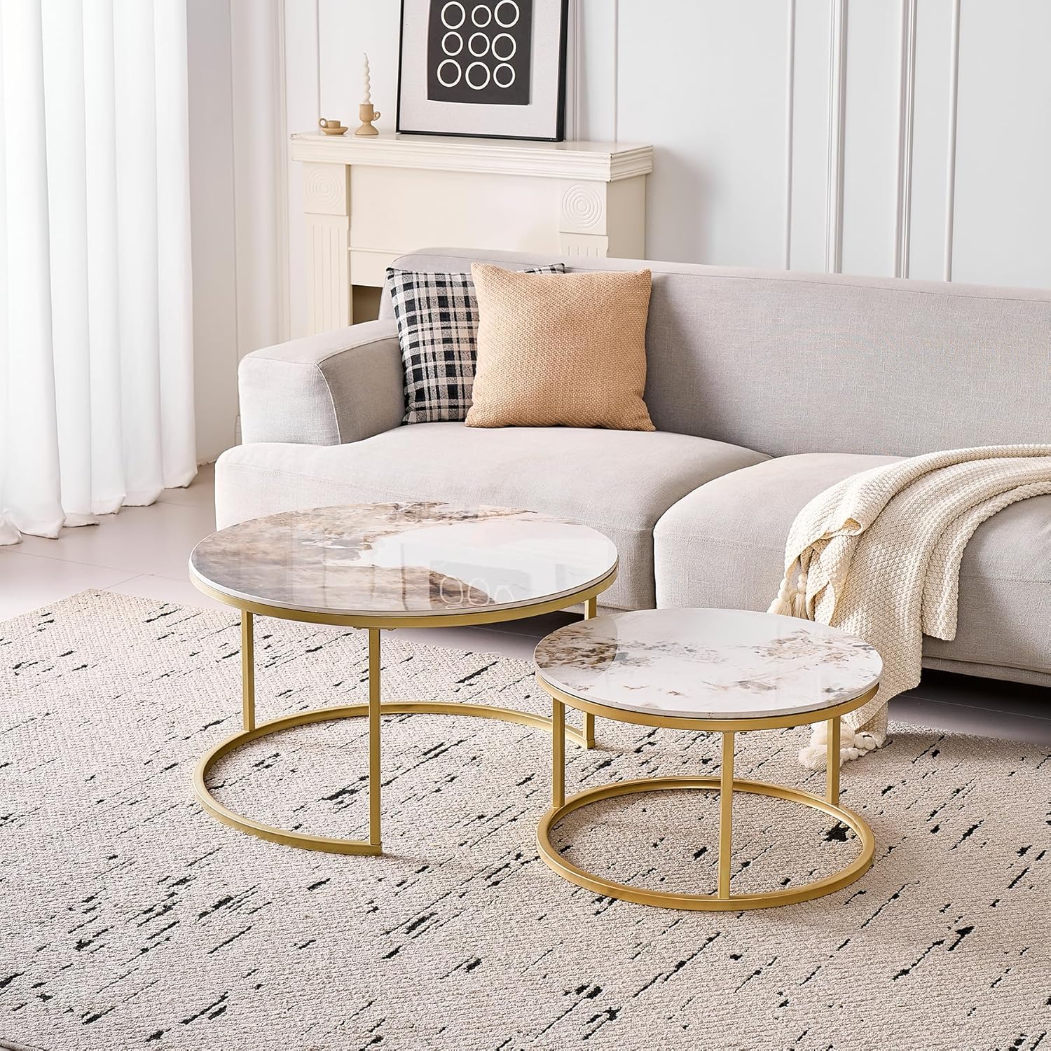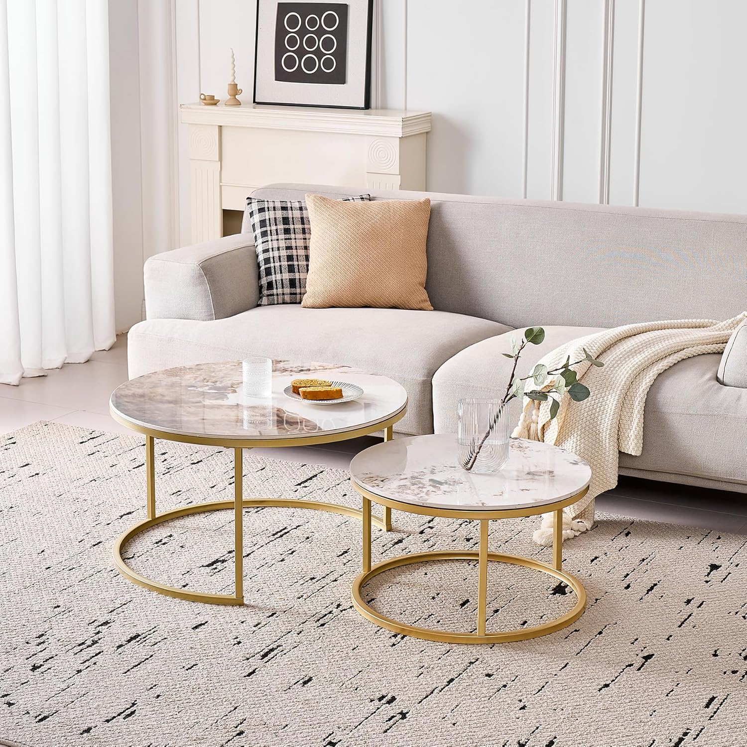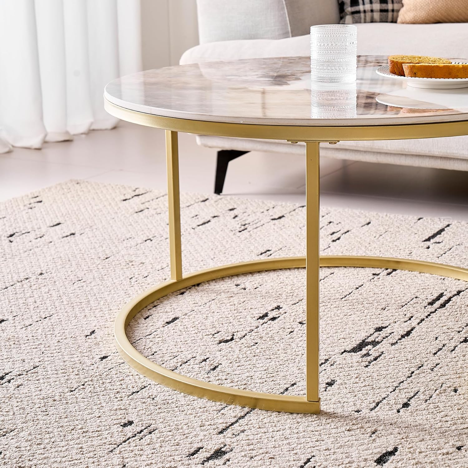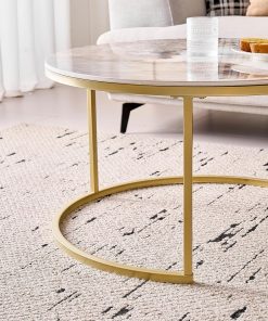 Lot de 2 Tables Basses Gigognes Ronde avec Plateau en Céramique Technique (Non en MDF),Tables D’Appoint Idéal pour Salon, Chambre, Balcon (Pandora+Or), 60+80cm