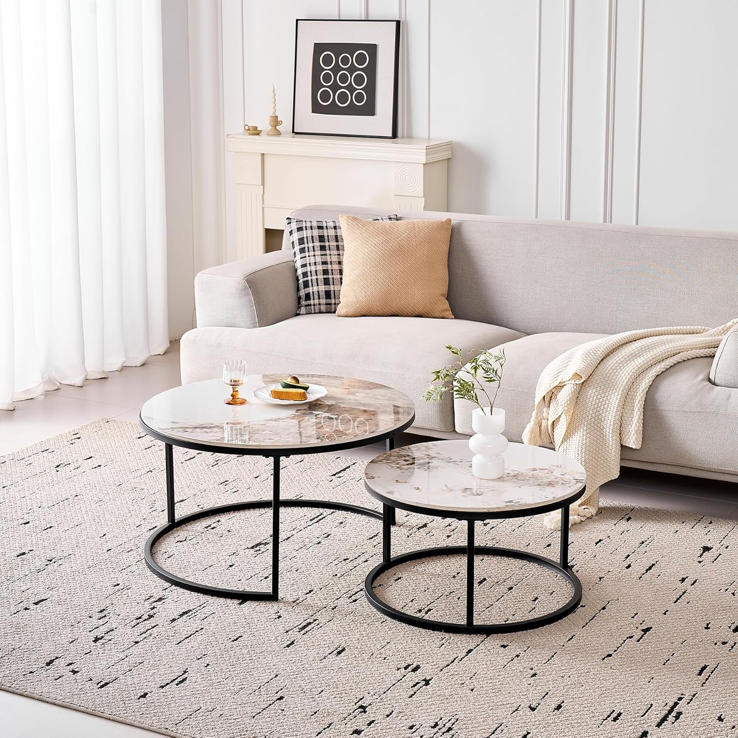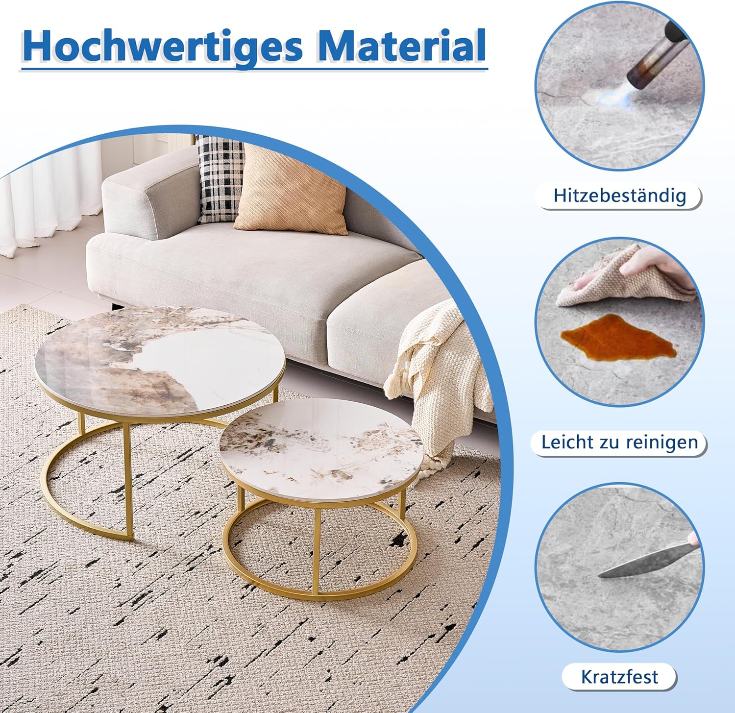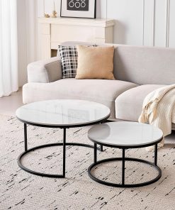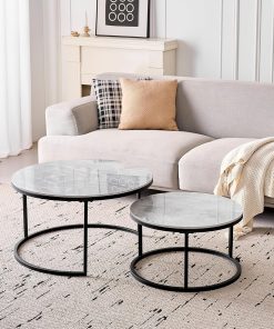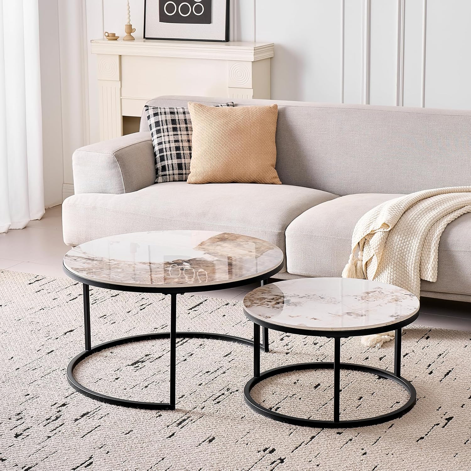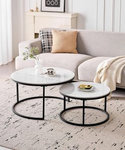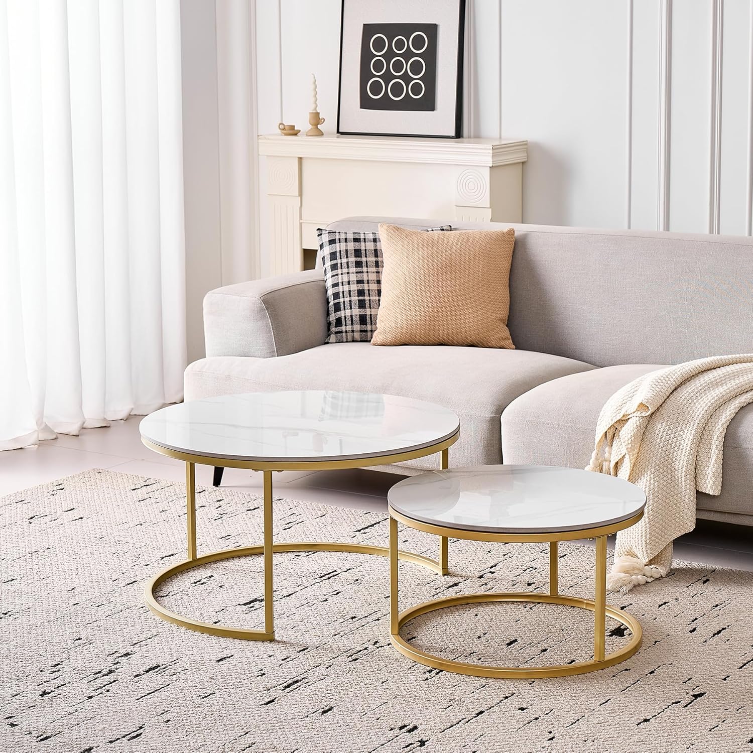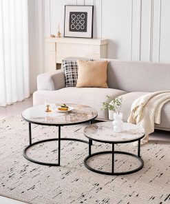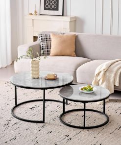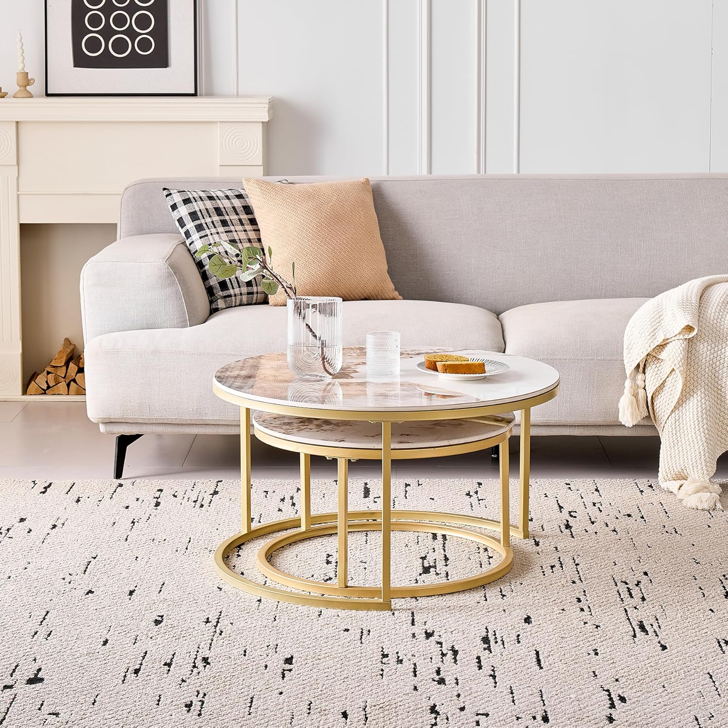 Lot de 2 Tables Basses Gigognes Ronde avec Plateau en Céramique Technique (Non en MDF),Tables D’Appoint Idéal pour Salon, Chambre, Balcon (Pandora+Or), 60+80cm