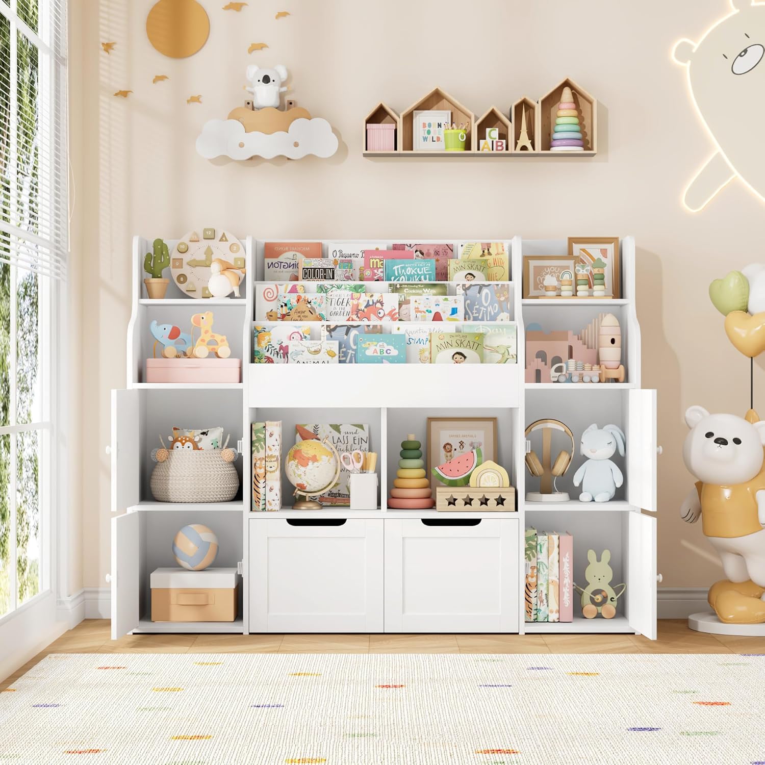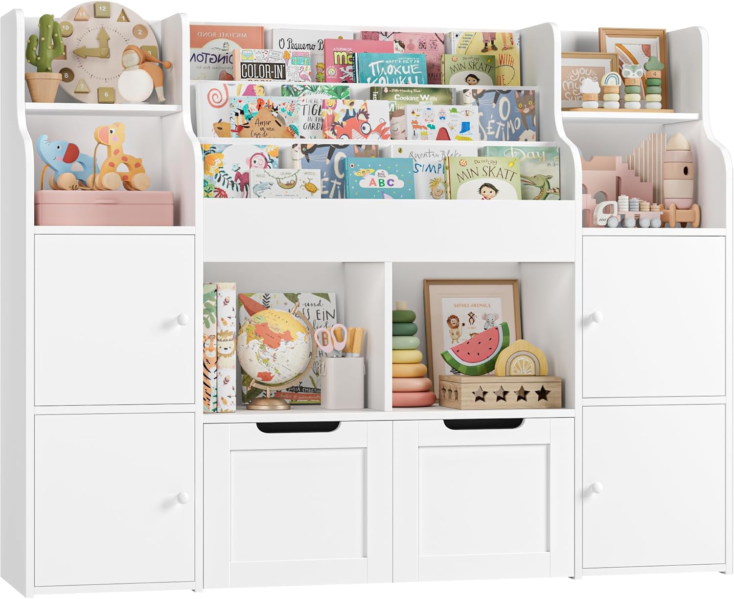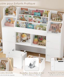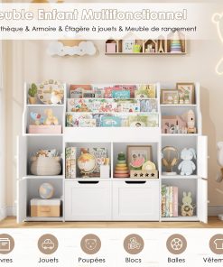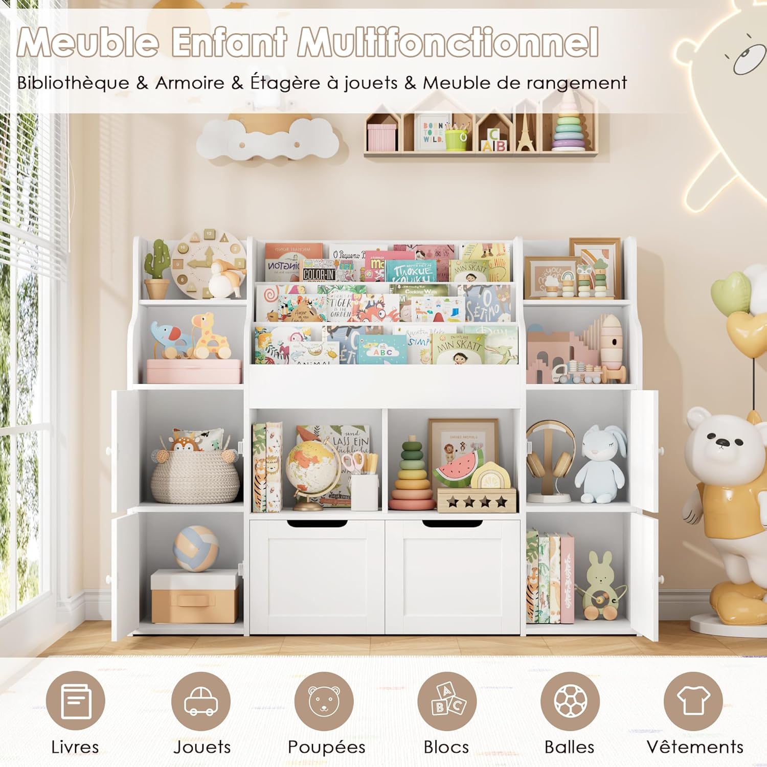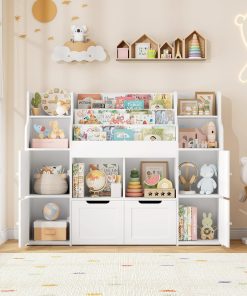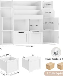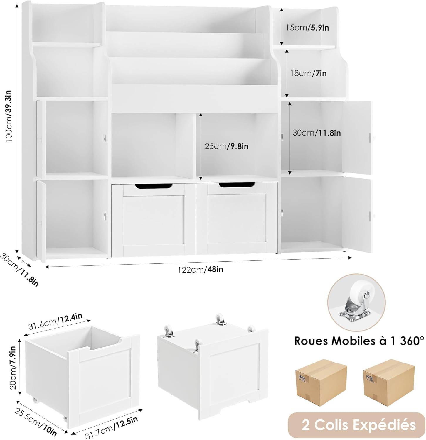 FOREHILL Meuble de Rangement Enfant Bibliothèque Enfant avec 13 Étagères Rangement Jouet avec 2 Tiroirs Roulants 2 Portes pour Chambre d’enfants Salle de Jeu 122x30x100cm Blanc