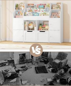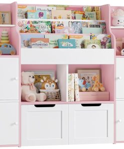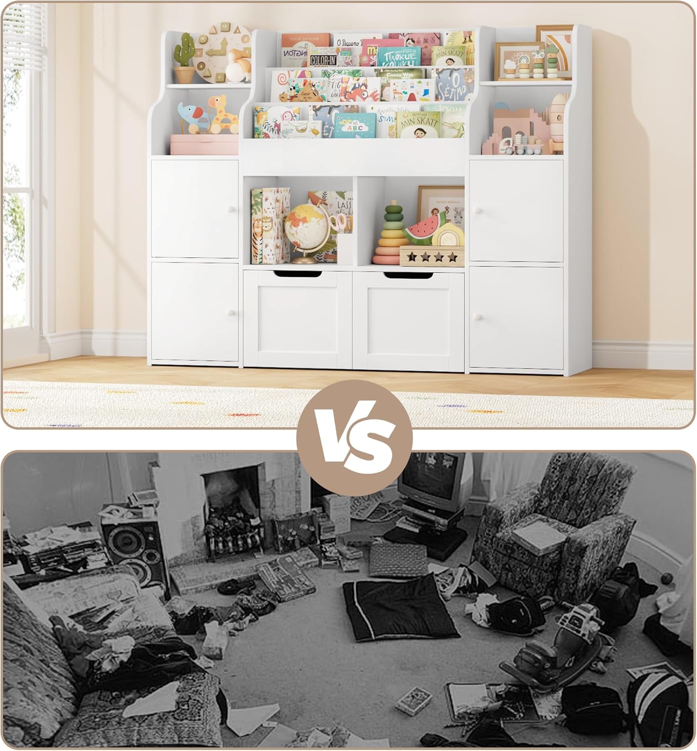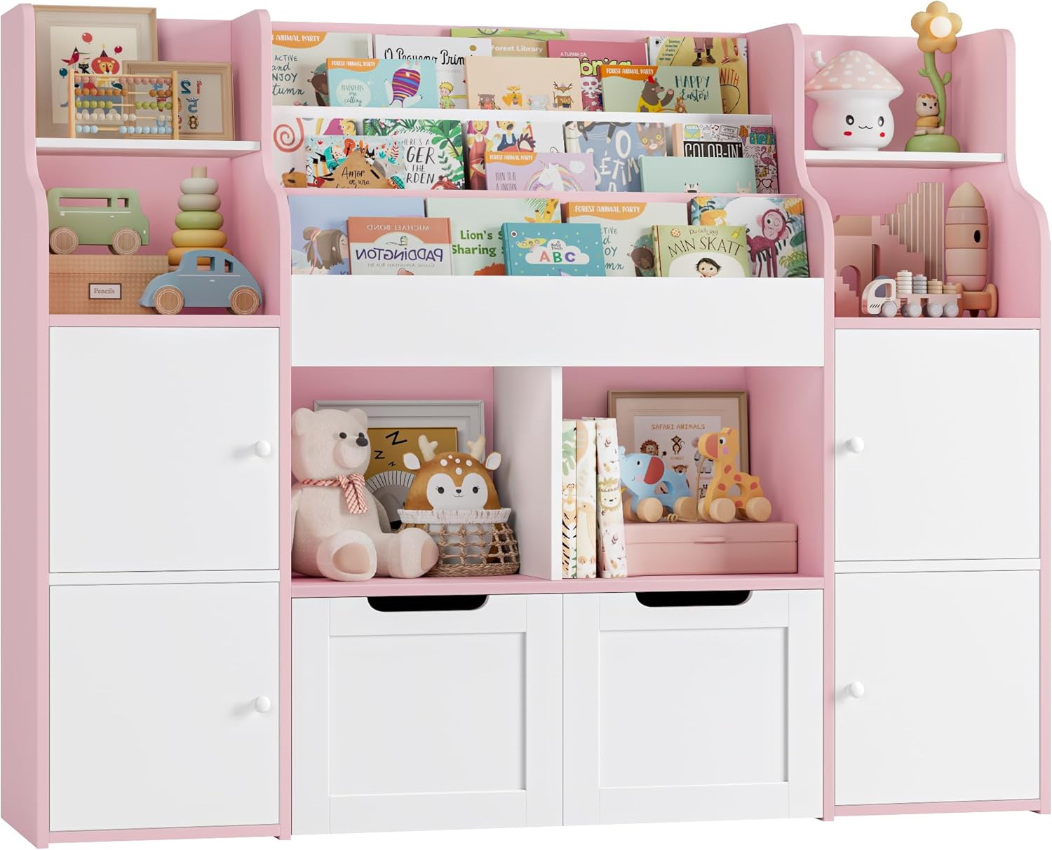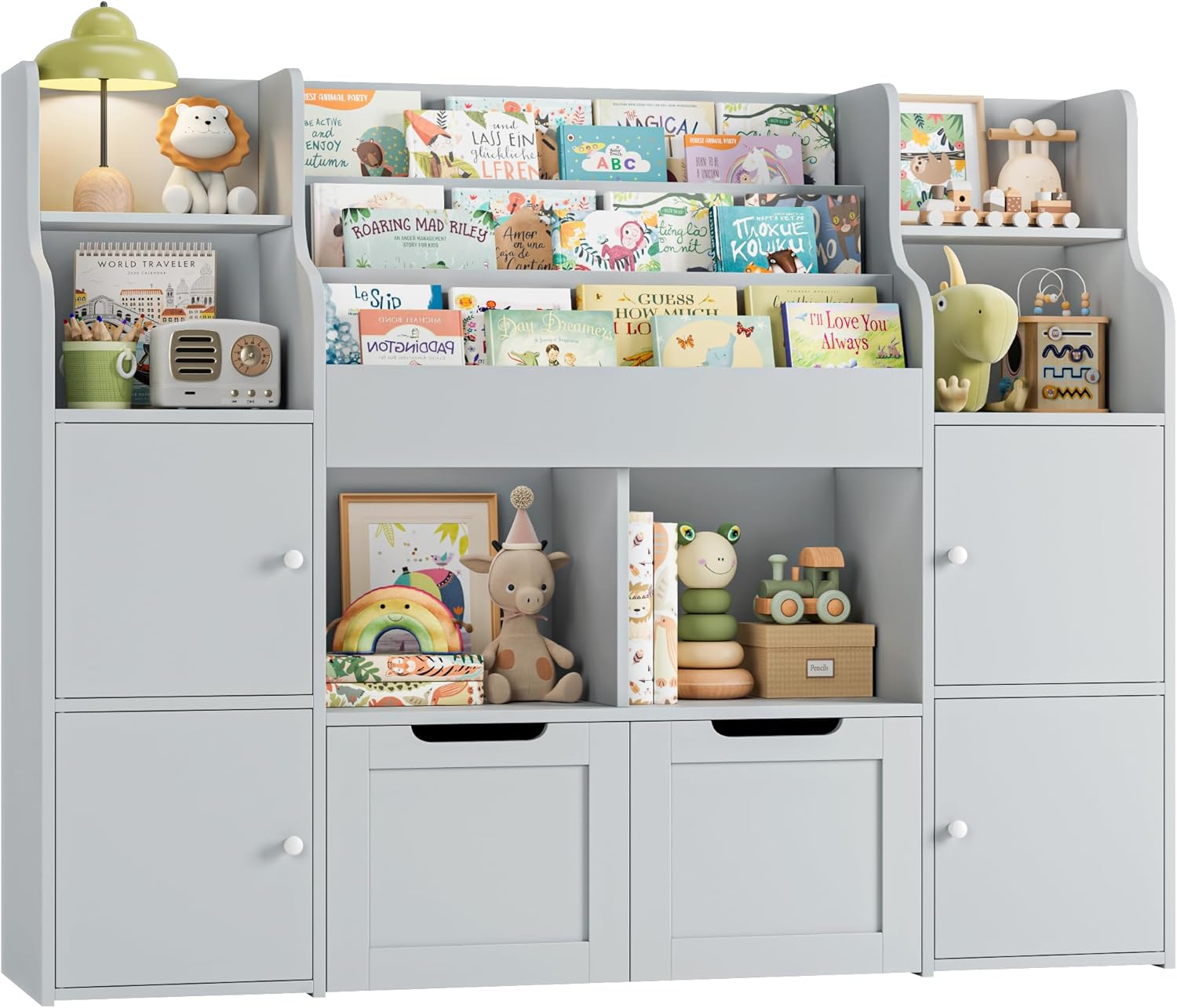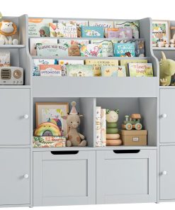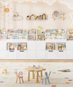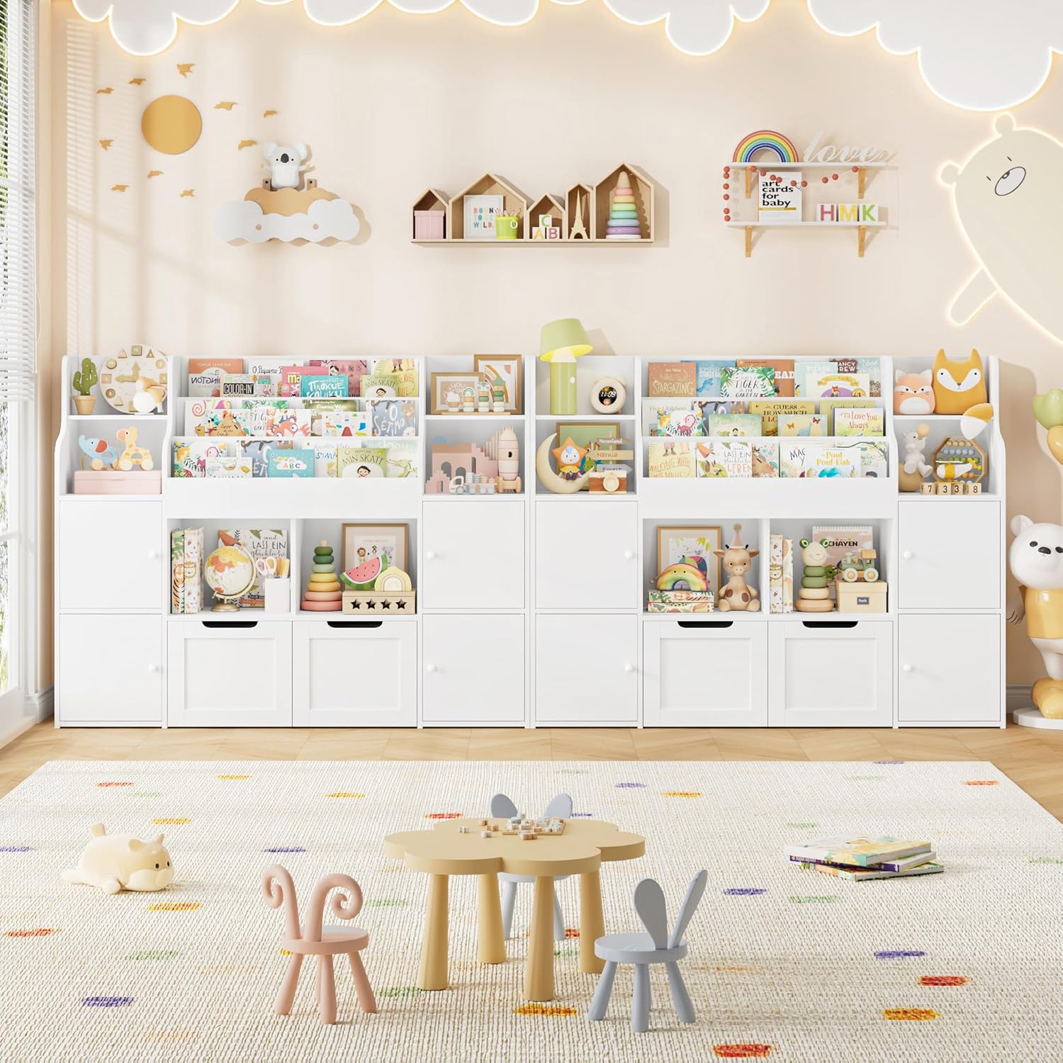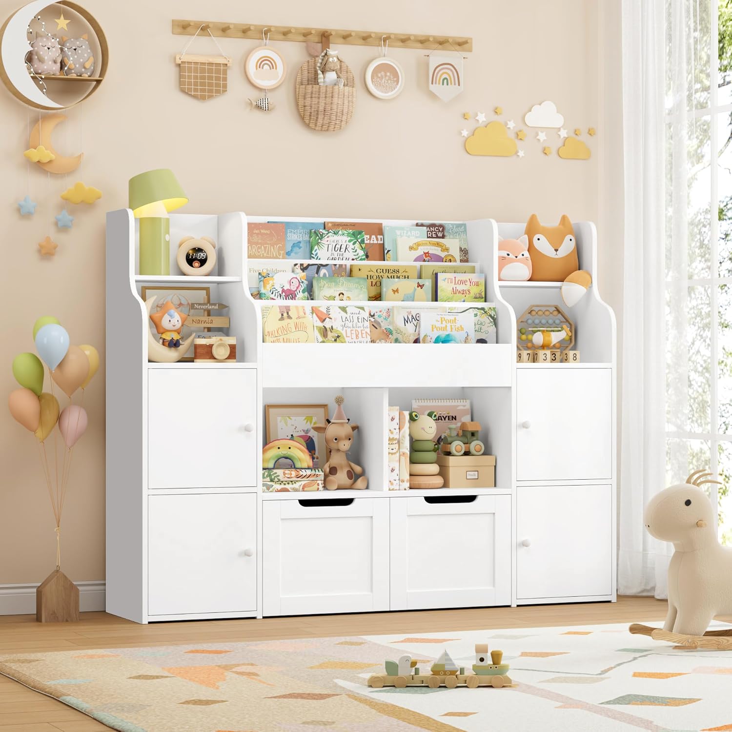 FOREHILL Meuble de Rangement Enfant Bibliothèque Enfant avec 13 Étagères Rangement Jouet avec 2 Tiroirs Roulants 2 Portes pour Chambre d’enfants Salle de Jeu 122x30x100cm Blanc