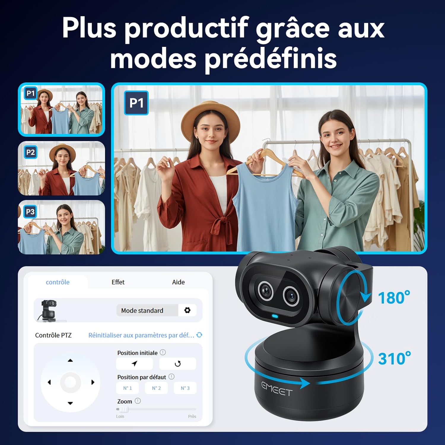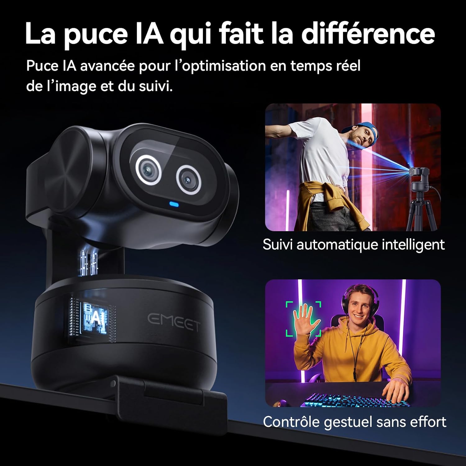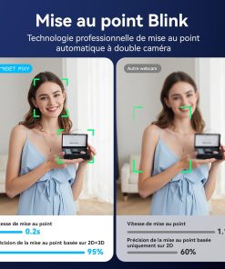 - Première webcam PTZ 4K à double caméra et IA au monde, EMEET PIXY combine une caméra principale 4K, une mise au point de phase PDAF et un capteur 1/2,55" pour des vidéos ultra-nettes. Une autre caméra auxiliaire IA détecte la position des visages, optimise l'autofocus et l'exposition, et présente des tons chair parfaits quelle que soit la luminosité. L'autofocus PDAF et IA fonctionnent ensemble pour une mise au point en seulement 0,2 seconde, contre 1,1 seconde pour les autres produits. Idéale pour les scènes statiques et dynamiques, telles que les diffusions beauté en direct, les démonstrations de produits, les émissions de fitness, les cours en ligne, les réunions d'affaires, etc.