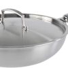 - Dimensions : 30 cm de diamètre, 9,5 cm de haut — couvercle en verre avec valve à vapeur, rebord et poignée en acier inoxydable