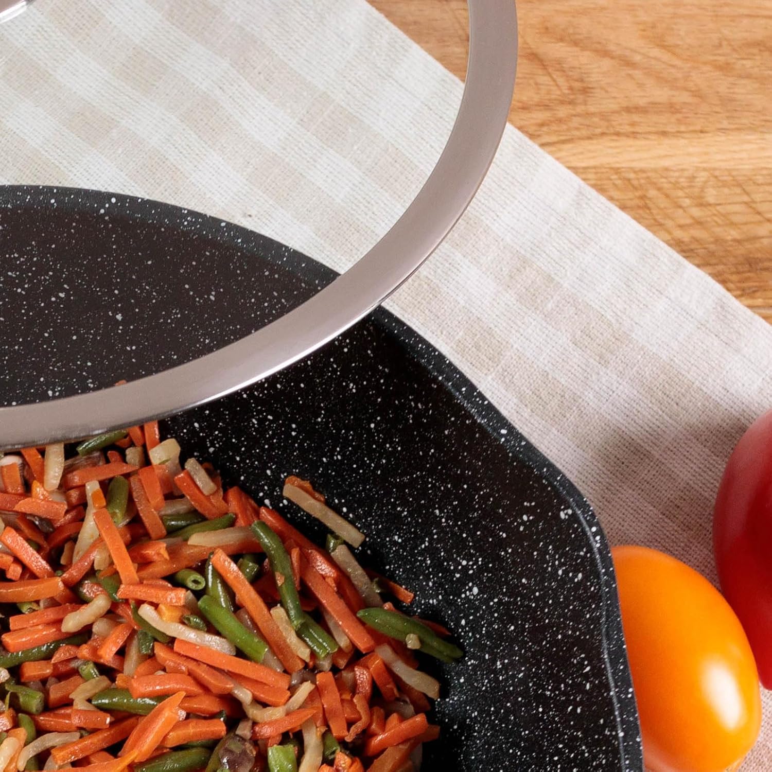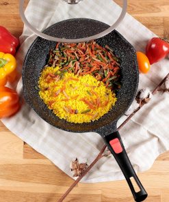 Wok Kamberg de 30 cm de diamètre et 9, 5 cm de hauteur en fonte d'aluminium, sans PFOA, est munie d'un revêtement anti-adhérent de haute performance façon pierre qui vous permet de conserver l'authenticité du goût des aliments, sans ajout de matière grasse. La fonte d'aluminium vous garantit une résistance longue durée et une indéformabilité. La collection Kamberg est certifiée tout types de feux: induction, gaz, ardoise "plaques électriques et vitrocéramique. Equipée d'un manche amovible ce wok 30 cm vous simplifie le nettoyage, Le rangement et la prise en main. Cette collection Passe au lave-vaisselle.