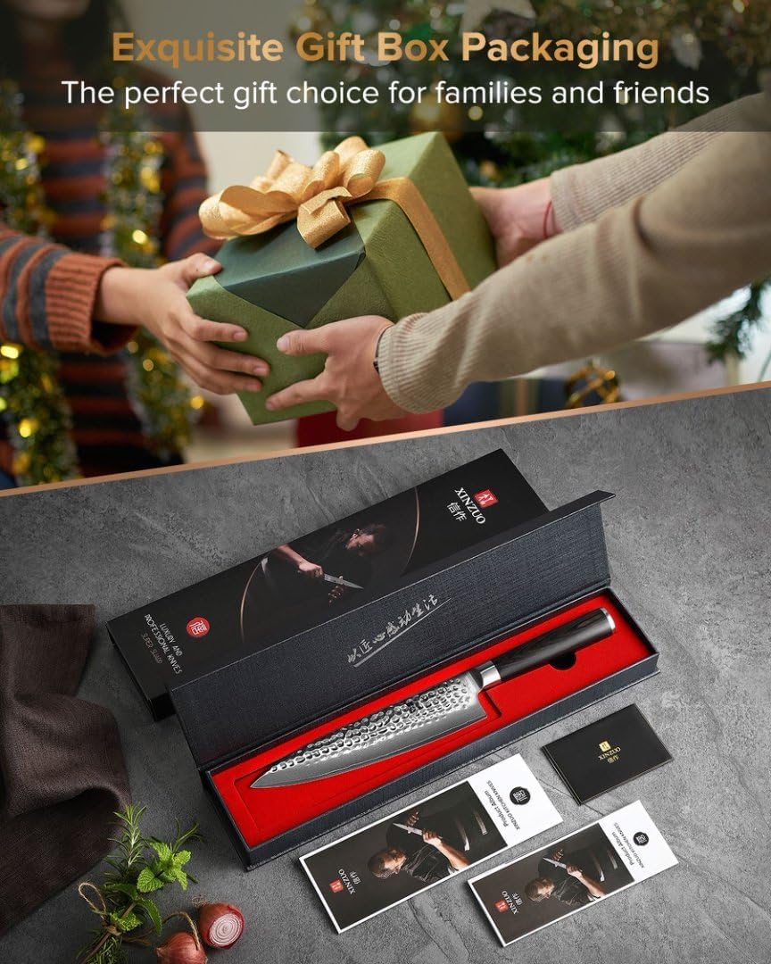 - 【Marque XINZUO】 Le couteau de cuisine XINZUO est un choix idéal pour les chefs professionnels et les passionnés de cuisine, débutants. Livré avec une belle boîte cadeau, adaptée aux cadeaux de vacances ainsi qu'à un usage quotidien. Si vous n'êtes pas satisfait du produit pour quelque raison que ce soit, veuillez contacter notre service client et nous résoudrons votre problème dans les plus brefs délais.